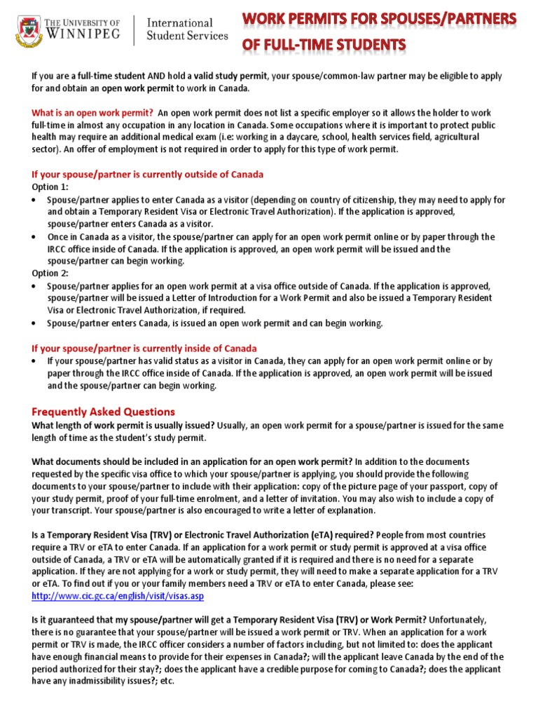 Brief description of duties field: * you apply for the open work permit when your spouse applies for their study permit and your application is. As mentioned before, in order to know whether you are qualified for an open work permit for.